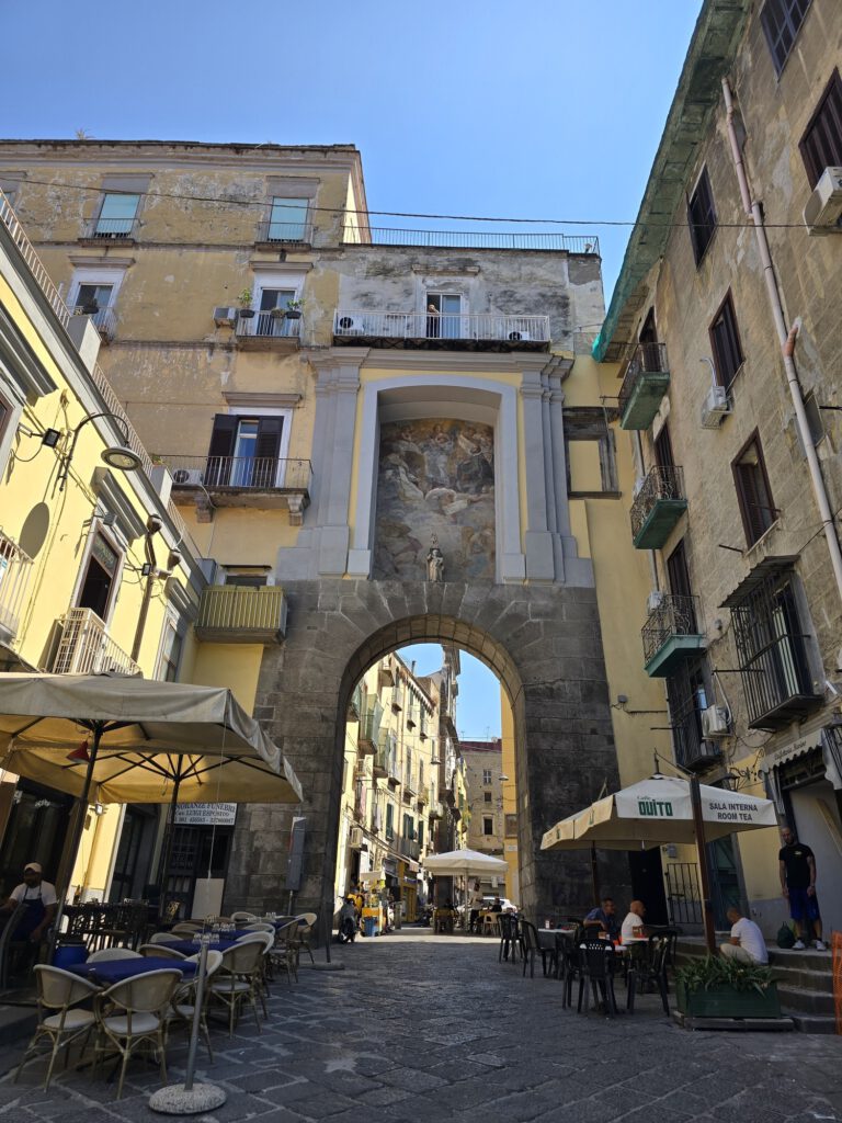 Nadat we ons in het hotel hadden geïnstalleerd, namen we een taxi naar Porta San Gennaro. Een van de oudste stadspoorten van Napels en al eeuwenlang een toegang tot dit deel van de stad. Vanaf hier begonnen we onze eerste echte verkenning van Rione Sanità, een wijk die bekendstaat om haar uitgesproken karakter, barokke architectuur en sterke Napolitaanse ziel.