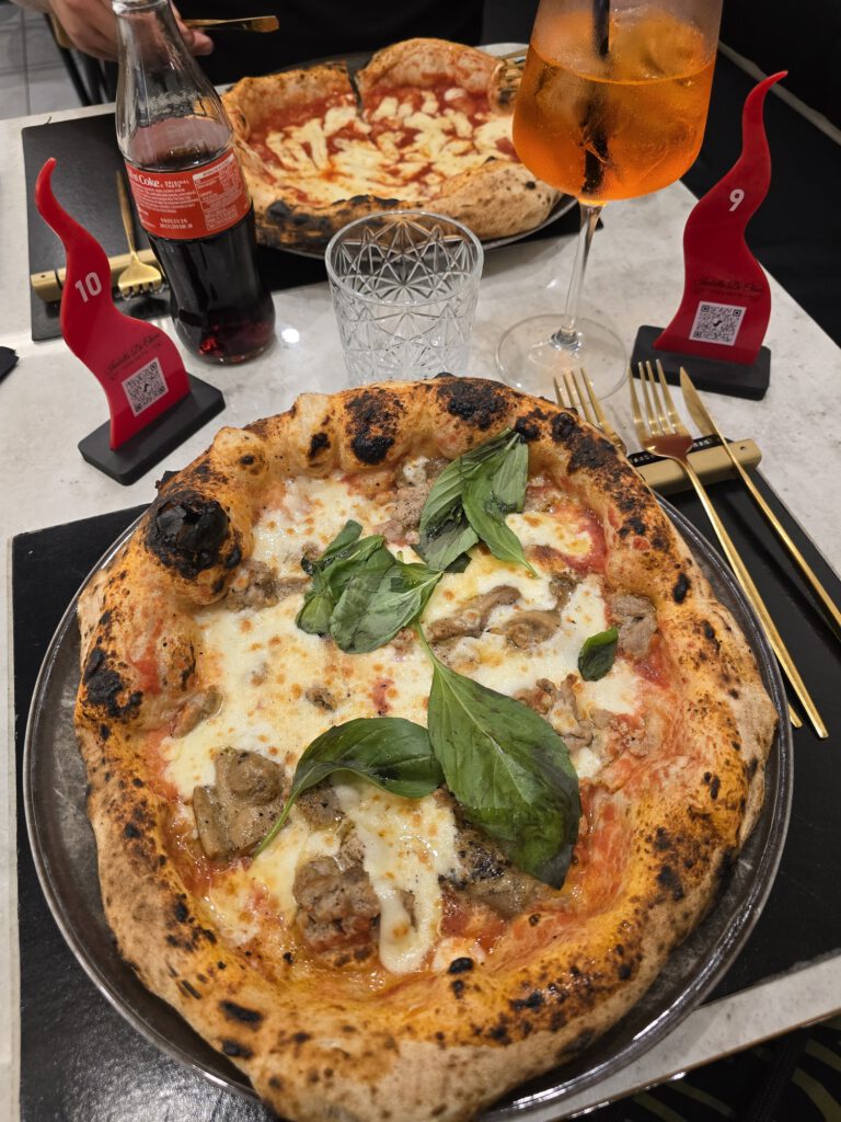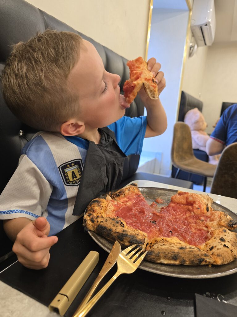 Na wat omzwervingen streken we neer bij Isabella De Cham voor de lunch. Thijs bestelde, zoals gewoonlijk, een pizza rossa. Michel ging voor een klassieke margherita en ik koos de Porcina, belegd met pomodoro San Marzano, provola, salsiccia, funghi porcini en een snufje zwarte peper. Een geweldige combinatie, vol smaak en precies wat je hoopt te eten op je eerste middag in Napels.