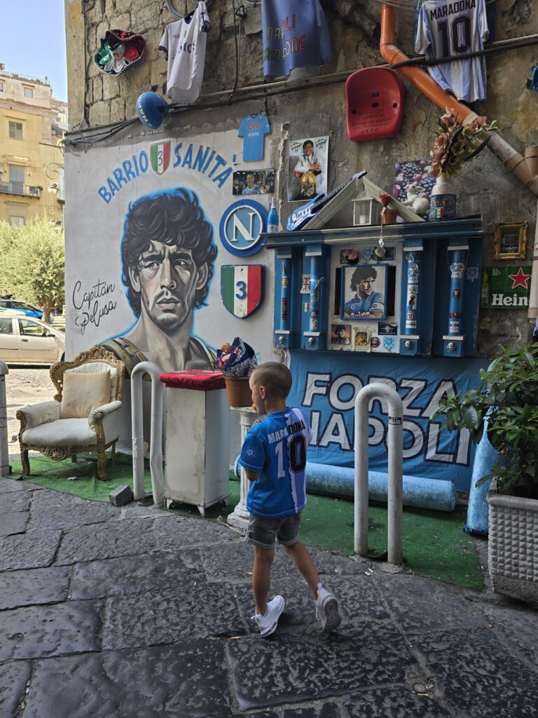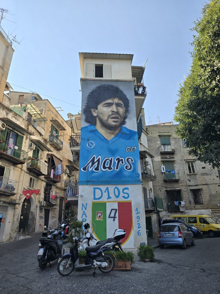 Even later stuitten we ook nog op een indrukwekkende muurschildering van Maradona. In Napels duikt hij overal op, als voetbalheld, volksicoon en bijna heilige figuur. Je merkt aan alles dat hij hier nog steeds diep in het stadsgevoel verankerd zit.