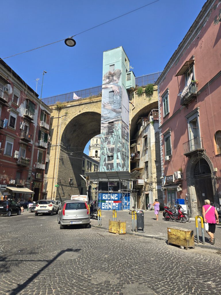Van daaruit wandelden we richting de Ponte della Sanità, het grote viaduct dat aan het begin van de negentiende eeuw werd aangelegd om de verbinding met het hoger gelegen deel van de stad, waaronder Capodimonte, te verbeteren. Het is een plek die heel goed laat zien hoe gelaagd Napels is: onder je leeft de wijk, boven je loopt de stad gewoon verder.