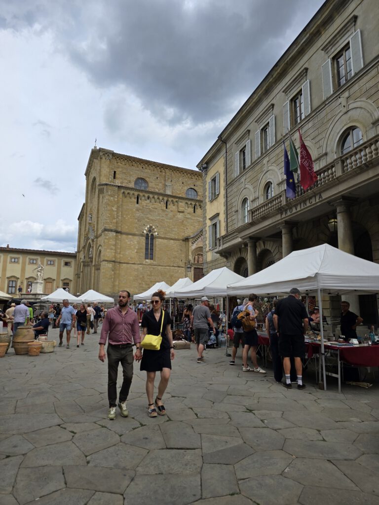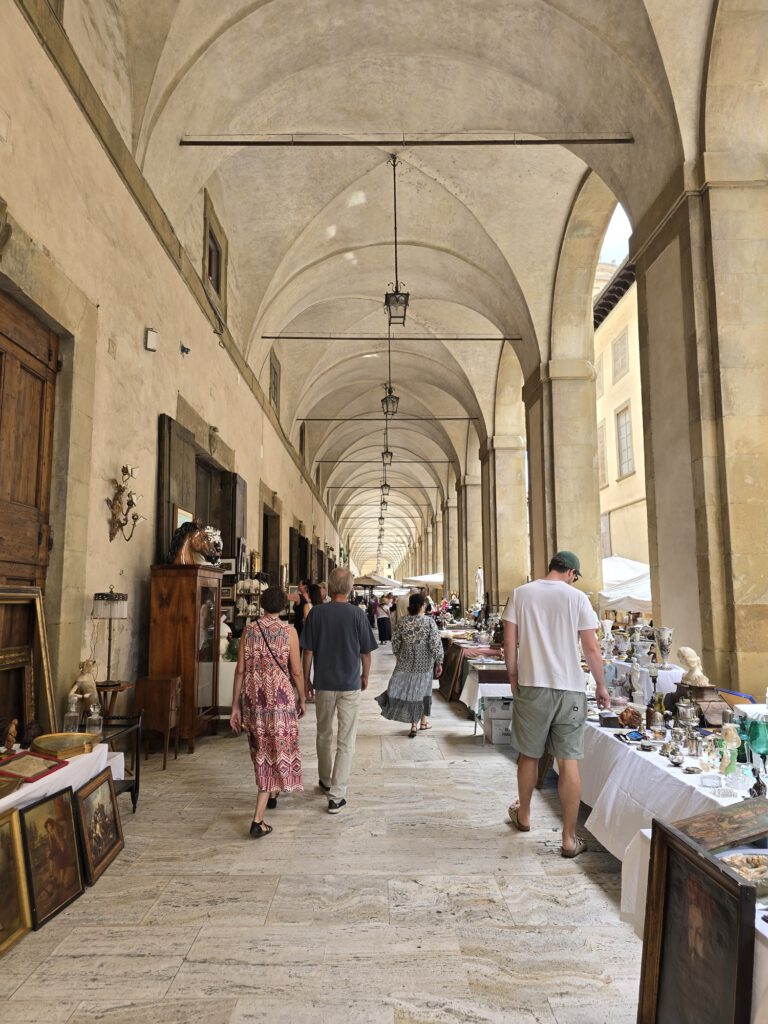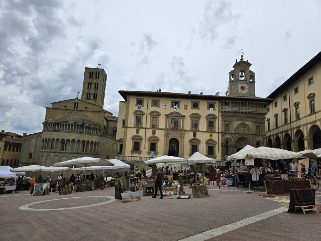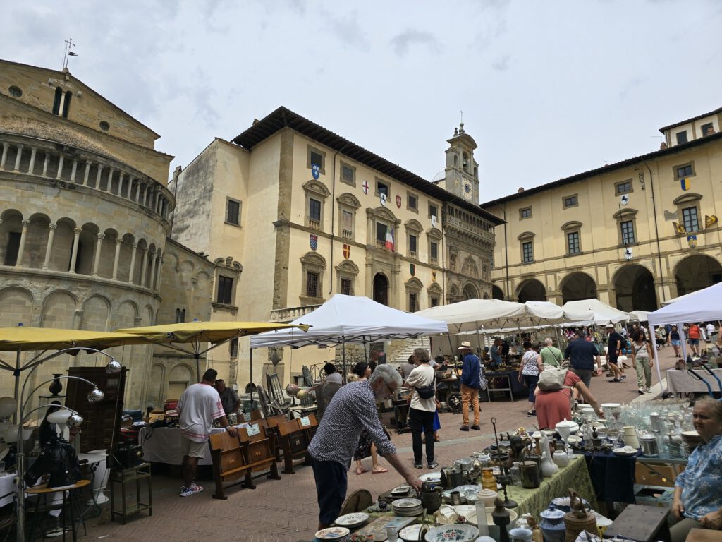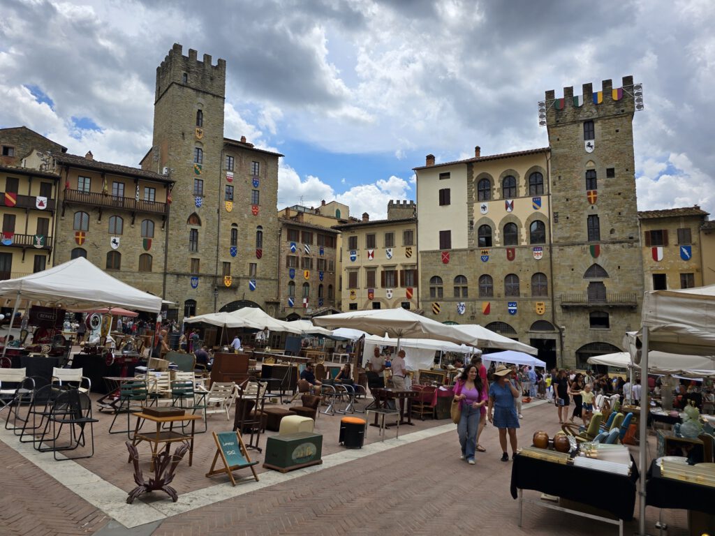 Na ons drankje wandelden we verder naar Piazza Grande, misschien wel een van de mooiste plekken van Arezzo. Dit plein heeft een heel eigen karakter en straalt aan alle kanten geschiedenis en sfeer uit. Tijdens de antiekmarkt is dit natuurlijk extra bijzonder, omdat de kramen en bezoekers het plein nog levendiger maken.