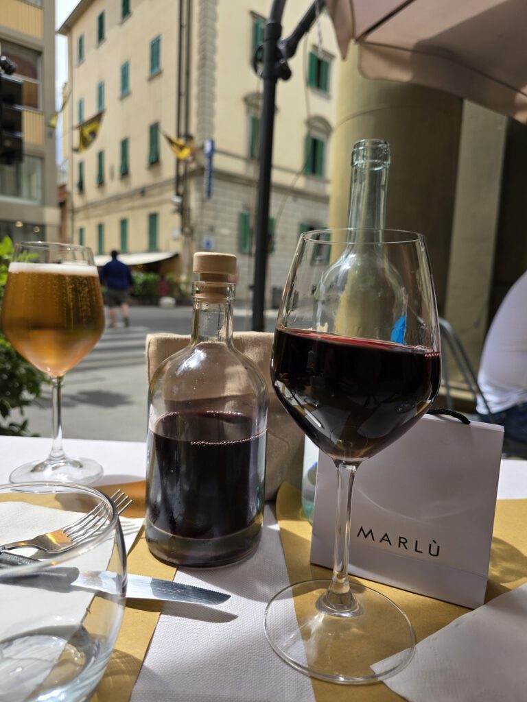 Inmiddels was het al ruim etenstijd geworden. Zoals wel vaker op drukke marktdagen zaten de terrassen in het centrum overal vol. We liepen nog even verder, in de hoop dat er ergens toch nog een plekje vrij zou zijn en uiteindelijk streken we neer bij La Taverna del Portico. Alleen de ligging al maakte het de moeite waard: prachtig onder de arcades, midden in de sfeervolle binnenstad van Arezzo.