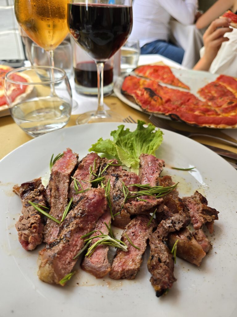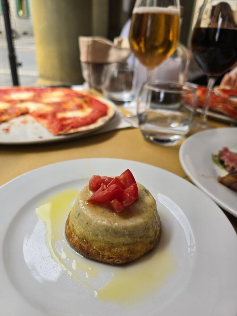 Michel en Thijs kozen allebei voor een pizza, terwijl ik voor de tagliata al rosmarino ging, met daarbij een flan di carciofi. Wat ik me daar precies bij moest voorstellen, wist ik eerlijk gezegd niet, maar omdat ik dol ben op artisjok, besloot ik het gewoon te bestellen. Achteraf bleek dat een schot in de roos: het was een zachte, hartige artisjokcustard, vol smaak en heerlijk romig van structuur. Echt ontzettend lekker.
