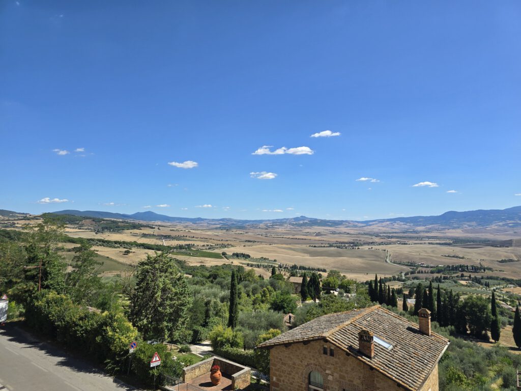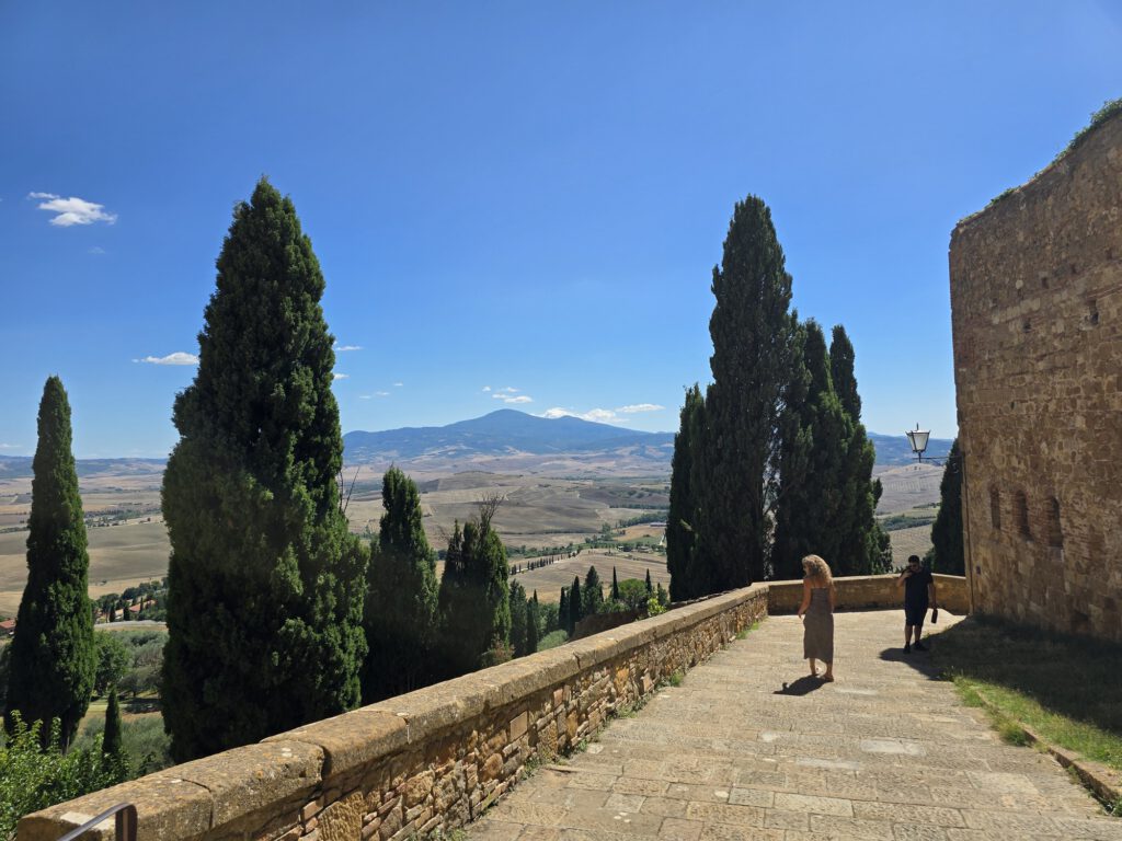 Onze wandeling vervolgen we via Via Gozzante en Via del Casello, vanwaar we een prachtig uitzicht hebben over de glooiende heuvels van Val d’Orcia. Het landschap, met zijn cipressen en wijngaarden, is werkelijk adembenemend en vormt het perfecte decor voor een paar mooie foto’s.
